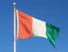 The Irish flag has a similar color layout to the Ivorian one, but with the green on the hoist side and wider proportions (1:2 rather than 2:3). When Murielle Ahouré celebrated winning the 2018 world indoor 60-meter dash, for lack of an Ivorian flag to wave, she borrowed an Irish flag from a spectator and reversed it.[12] Due to this similarity, in Northern Ireland, Ulster loyalists have sometimes desecrated the Ivorian flag, mistaking it for the Irish one.[13][14] In some cases, Ivorian flags displayed in Northern Ireland have signs explicitly labelling them as such nearby to avoid having them desecrated by Ulster loyalists mistaking them for Irish ones.[15]