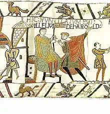 Research was carried out by Deputy Bailiff Sir Graham Dorey, of Guernsey's Flag Investigation Committee. The committee considered a number of designs. It was initially considered that the new flag for Guernsey should contain green, but it was ruled that the colour green has no historical basis in Guernsey aside of being used as a sporting colour by the Guernsey national football team in Muratti matches. Consideration was given to using the coat of arms of Guernsey on a St George's Cross but this was rejected on the grounds that the arms would be unidentifiable at a distance. It was also decided that to do so would be to focus on English symbols, not recognising Guernsey's independence or Norman history.[6] The committee eventually settled on including a gold cross on top of the St George's Cross. The gold cross was chosen as it was a symbol of King William the Conqueror, seen on a banner at the Battle of Hastings, as portrayed on the Bayeux Tapestry.[6] That banner was purportedly given to William by Pope Alexander II as a symbol of his blessing for the Norman Conquest of England along with a request for the clergy of the Church of England to give way to William.[4] The new flag's design was to symbolise that the islanders were of Norman descent but loyal to the English (and later British) Crown. In 1985 Queen Elizabeth II, Duke of Normandy, granted a Royal Warrant for the flag to become the official flag of Guernsey. Unveiled on 15 February 1985, the flag was flown for the first time on Liberation Day on 9 May, the 40th anniversary of the Channel Islands' liberation from German occupation during the Second World War.[7]