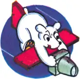 - ↑ A white caricatured bear, grasping a black aerial camera proper in the forepaws, leaning and diving through space on a wing section formed by two red planks, and having a tail rudder of the same material, all emitting white speed lines and mounted on a light blue disc. Maurer, Combat Squadrons, p. 90.