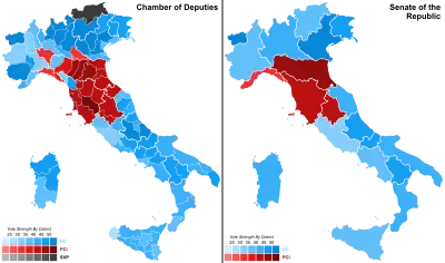 The 1968 Italian general election was held in Italy on 19 May 1968.[1] The Christian Democracy (DC) remained stable around 38% of the votes. They were marked by a victory of the Communist Party (PCI) passing from 25% of 1963 to c. 30% at the Senate, where it presented jointly with the new Italian Socialist Party of Proletarian Unity (PSIUP), which included members of Socialist Party (PSI) which disagreed the latter's alliance with DC. PSIUP gained c. 4.5% at the Chamber. The Socialist Party and the Democratic Socialist Party (PSDI) presented together as the Unified PSI–PSDI, but gained c. 15%, far less than the sum of what the two parties had obtained separately in 1963.