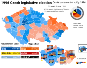 Parliamentary elections were held in the Czech Republic on 31 May and 1 June 1996,[1] the first after independence. The result was a victory for the Civic Democratic Party, which won 68 of the 200 seats. Voter turnout was 76.3%.[2]