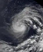Jimmy continued northwestward through a break in the subtropical ridge caused by Isa, and it steadily intensified as it tracked through an area of light vertical wind shear. It recurved to the northeast, and shortly after reaching its westernmost point Jimmy attained its peak intensity of 55 mph on April 24.[10] Conversely, JMA assessed Jimmy as remaining a minimal tropical storm throughout its duration.[7] After maintaining peak winds for about 18 hours, to increased southwesterly winds aloft quickly weakened the storm, and late on April 25 JTWC issued its final advisory on Jimmy after its low-level circulation center became completely exposed from the deep convection. On April 26, Jimmy was absorbed by an approaching frontal trough over the open Pacific Ocean. The storm had little effects on land.[10]