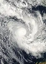 On 20 April, moved over the Gulf of Carpentaria and began to re-intensify.[37] Over the following few days, deep convection formed around a 37 km (23 mi) wide eye.[38] Early on 22 April, the Bureau of Meteorology assessed Monica to have attained Category 5 status, on the Australian cyclone intensity scale.[22] The JTWC also upgraded Monica to a Category 5 equivalent cyclone, on the Saffir–Simpson Hurricane Scale.[39] The storm attained its peak intensity the following day with winds of 250 km/h (155 km/h 10-minute sustained) and a barometric pressure of 916 hPa (mbar).[22] At the same time, the JTWC assessed the storm to have attained winds of 285 km/h (177 mph) 1-minute sustained), ranking it as one of the strongest storms ever recorded in the Southern Hemisphere.[39] On 24 April, Monica made landfall about 35 km (22 mi) west of Maningrida, at the same intensity. Rapid weakening took place as the storm moved over land. Less than 24 hours after landfall, the storm had weakened to a tropical low. The remnants of the former-Category 5 cyclone persisted until 28 April over northern Australia.[22][37]