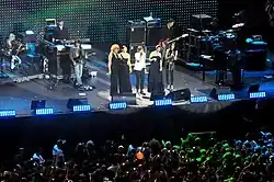 Starting from December 2013, Pausini promoted her greatest hits album through The Greatest Hits World Tour, giving concerts in her native Italy, as well as in other European countries, in Latin America, in the United States and in Canada. The tour also included performances during the Viña del Mar International Song Festival in Chile and the Feria del Hogar in Peru.[182][183] The concert she gave in Taormina, featuring several guests, was conceived as the first Italian "one woman show", and it was broadcast by Rai Uno in May 2014.[184] A new version of the album was released in November 2014 for the hispanophone market. The new edition includes a duet with Thalía in "Sino a ti", a new version of "Entre tu y mil mares", featuring Melendi, and a re-recording of "Donde quedo solo yo", performed with Álex Ubago.[185] The latter was also recorded under the title "Jo sempre hi seré", becoming Pausini's first Catalan song. This version was included in El disc de La Marató 2014, a compilation album related to the telethon organized by Catalan channel TV3, with the purpose to raise money against cardiovascular diseases.[186][187]