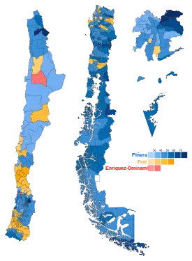 General elections were held in Chile on Sunday 13 December 2009 to elect the president, all 120 members of the Chamber of Deputies and 18 of the 38 members of the Senate were up for election. As no presidential candidate received a majority of the vote, a second round was held between the top two candidates—Sebastián Piñera and Eduardo Frei Ruiz-Tagle—on Sunday 17 January 2010.[1] Piñera won the runoff with 52% of the vote and succeeded Michelle Bachelet on 11 March 2010.