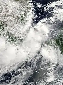 Early May 29, the season's first tropical depression consolidated near the Gulf of Tehuantepec. Large-scale southwesterly flow prompted the system to move slowly northeast. Scatterometer data indicated the depression soon strengthened into a tropical storm, at which time it was assigned the name Agatha. Attaining peak winds of 45 mph (70 km/h), Agatha soon made landfall late on May 29 near Champerico, Guatemala, just south of the border with Mexico. Once onshore, the mountainous terrain of Guatemala caused the storm to quickly dissipate early on May 30.[22]
