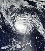 Late on the next day, the JTWC upgraded Sanvu to a category 1 typhoon, as an eye was seen on microwave imagery.[41] Late on May 24, the JMA upgraded Sanvu to a severe tropical storm.[42] Accelerating northeastward along the northwestern periphery of a subtropical ridge, the system reached its peak intensity by the next day, as its eye emerged on satellite imagery.[43][44][45] As its western quadrant got affected by a dry air entrainment on May 26, Sanvu started to weaken as it directly passed over Iwo Jima.[46] With strong vertical wind shear associated with a subtropical jet stream, along with rapidly cooling sea surface temperatures, the system continued to weaken.[47] The JTWC downgraded Sanvu to a tropical storm late on the same day, as the system's low level circulation center started to become exposed.[48] The JMA followed suit by the next day.[49] The JTWC subsequently issued their final advisory on Sanvu, as it commenced extratropical transition.[50] However, the JMA continued issuing advisories on Sanvu, until by the next day, when it fully transitioned into an extratropical cyclone.[51][52] The remnants of the system was last noted during May 30.[53]