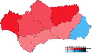 The Parliament of Andalusia was the devolved, unicameral legislature of the autonomous community of Andalusia, having legislative power in regional matters as defined by the Spanish Constitution and the Andalusian Statute of Autonomy, as well as the ability to vote confidence in or withdraw it from a regional president.[10] Voting for the Parliament was on the basis of universal suffrage, which comprised all nationals over 18 years of age, registered in Andalusia and in full enjoyment of their political rights. Additionally, Andalusians abroad were required to apply for voting before being permitted to vote, a system known as "begged" or expat vote (Spanish: Voto rogado).[11]