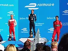 The top three drivers appeared on the podium to collect their trophies and spoke to the media in a later press conference. On the way back to pit lane, Buemi declared his satisfaction over his success to commentator Dario Franchitti but he admitted the victory was handed to him "on a plate".[53] He stated he felt Rosenqvist was the deserving victor but was happy with the pace of his car: "I think we were more or less the same pace [as Rosenqvist]. I’m very happy with that result, it just tastes a little bit different than normal."[55] Rosenqvist spoke of his belief in the short-term he would look back at the weekend positively for himself and Mahindra but was "disappointed" to finish second: "Today, we were under pressure from Sébastien, we knew that we would be close as they looked very strong compared to yesterday. I knew that I had to drive a perfect race, every corner we had to drive perfect. I think we did a great job."[55] Third-place finisher di Grassi said he enjoyed his battle against Vergne and claimed his car was quicker than in the second race due to speed his team extricated from it the previous day: "There is still a couple of tenths we need to find to be able to fight [for the win]."[55]