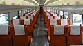 The standard-class seating arrangement used in the original 253 series sets was unusual for Japanese limited express trains in consisting of European-style fixed four-seat bays. The seats were later rearranged in a fixed unidirectional layout facing four-seat bays in the centre of each car between 2003 and 2004. The green (first class) cars in the original three-car sets were classified as KuRo 253 or KuRo 253-100.[6] The KuRo 253 cars had ten rows of 1+1 seating at a seat pitch of 1,090 mm (43 in), with seats angled to face the windows, together with one 4-person compartment.[6] The KuRo 253-100 cars had eight rows of seats arranged in a mixture of 2+1 and 1+1 at a seat pitch of 1,340 mm (53 in), together with one 4-person compartment.[6]