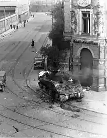 The 741st led the 2nd Infantry Division's assault on Hill 192 on 11–12 July in the breakout from Normandy. Hill 192, the dominant terrain east of St. Lô, had to be taken in order for the American forces to liberate St. Lõ and establish an organized front line from which to launch Operation Cobra.[18] After taking Hill 192, the 2nd Infantry Division went on the defensive until the start of Operation Cobra. On 26 July, the 2nd Infantry Division, with the 741st Tank Battalion continuing to provide direct fire support, advanced slowly, anchoring the left flank of the main assault of Operation Cobra, which took place to the west of St. Lõ. The division and the 741st advanced together as far as Tinchebray before new orders temporarily sent them on divergent paths. The 2nd Infantry Division was withdrawn from the line in order to reduce the fortress at Brest[19] while the 741st Tank Battalion reverted to 3rd Armored Group control, under whose direction the battalion raced across western France to the outskirts of Paris at Sceaux.[20][21] On 27 August, it was attached to the 28th Infantry Division[20] in order to participate with the division in the Liberation Day Parade through Paris on 29 August, a tumultuous procession around the Arc de Triomphe and down the Champs-Élysées just four days after the Germans had formally surrendered the city.[22] After a brief two-day respite, the battalion was on the march again; this time through Compiègne, the Aisne valley and Belgian Luxembourg and into the Duchy of Luxembourg,[22] reaching the West Wall in Germany by 9 September in the vicinity of Sevenig and Roscheid.[23][24] On 2 October, the 741st Tank Battalion was relieved from attachment to the 28th Infantry Division and again attached to the 2nd Infantry Division, with which it remained until the end of the war.[25]