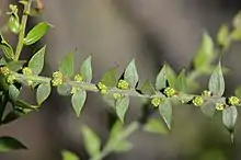 The bushy and prickly shrub typically grows to a height of 0.4 to 1.5 metres (1 to 5 ft)[3] with an erect or decumbent habit. The branchlets are terete with fine ridges and light to densely hairy. The sessile phyllodes have an ovate to lanceolate or elliptic shape and are 0.8 to 1.5 centimetres (0.31 to 0.59 in) in length and 2 to 4 millimetres (0.079 to 0.157 in) wide.[1] It blooms from July to October and produces yellow flowers.[3] The simple axillary inflorescences have globose heads containing 12 to 18 bright yellow flowers and have a diameter of 4 to 6.5 mm (0.157 to 0.256 in). Following flowering curved to twisted seed pods form with a length of 3 to 7 cm (1.2 to 2.8 in) and are 3 to 5 mm (0.118 to 0.197 in) wide.[1]