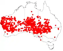 It occurs on floodplains and along watercourses in arid and semi-arid areas throughout Western Australia, South Australia, southern Northern Territory, and east to near Charleville, Queensland and Brewarrina, New South Wales[2] and is known to grow in a variety of habitats and soil types. In Western Australia it is found in the Pilbara, Gascoyne, Mid West, Wheatbelt and Goldfields-Esperance regions.[3]