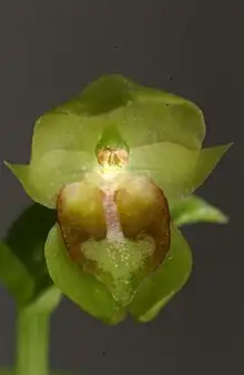 This species is distinguished from others in the genus by its relatively large leaf, large floral bracts and greenish and brown flowers[2]