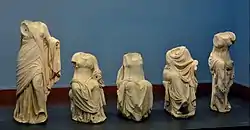 A group of statues of muses, including the famous Frankfurt Urania, was discovered in the Roman baths and is now in the Liebieghaus museum.[7] The figures, dating from 120-100BC, had been removed from their original location in ancient times and it is believed that they were originally from Delos near the temple of Apollo. The fine execution of the robes is especially skillful and their arrangement and textures emphasise the figures’ beautiful bodies. Although the condition of the group is somewhat fragmentary, the style is very naturalistic.