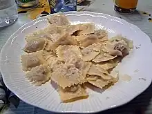 Agnolotti (Italian: [aɲɲoˈlɔtti]; Piedmontese: agnolòt, Piedmontese: [aɲʊˈlɔt]) is a type of stuffed pasta typical of the Piedmont region of Italy, made with small pieces of flattened dough folded over a filling of roasted meat[1] or vegetables. Agnolotti is the plural form of the Italian word "agnolotto". According to a legend, the origin of the name may come from a cook called Angiolino, or "Angelot", an individual from Montferrat who is said to be the inventor of the recipe.[2] Agnolotti can be di magro or di grasso depending on their filling of vegetables or meat.[2]