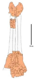 Aigialosaurus was a long- and narrow-snouted crocodylomorph.[1][5][6] The bony nostrils on both sides of the head were fused to form a single larger fenestra (skull opening), dubbed by Persson as a fenestra exonarina communis. The nasal bones on both sides of the skull extended forwards until reaching the margin of this skull opening, this being the main diagnostic feature of the genus.[7] Another diagnostic feature is the mandibular symphysis (the connection between the left and right mandible) of Aigialosuchus being unusually long,[1] 13.8 centimetres (5.4 inches),[8] and being reached by the splenial bone.[1]