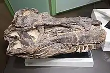 The type specimen is a partial skull collected on June 9, 1884 from an outcrop of the Horseshoe Canyon Formation alongside the Red Deer River in Alberta. It was recovered by an expedition of the Geological Survey of Canada, led by the famous geologist Joseph Burr Tyrrell. Due to a lack of specialised equipment, the almost complete skull could only be partially secured. In 1889, Tyrrell's colleague Thomas Chesmer Weston found an incomplete smaller skull associated with some skeletal material at a location nearby.[6] The two skulls were assigned to the preexisting species Laelaps incrassatus by Edward Drinker Cope in 1892.[7] Although the name Laelaps was preoccupied by a genus of mite and had been changed to Dryptosaurus in 1877 by Othniel Charles Marsh, Cope stubbornly refused to recognize the new name created by his archrival. However, Lawrence Lambe used the name Dryptosaurus incrassatus instead of Laelaps incrassatus when he described the remains in detail in 1903 and 1904,[8][9] which was a combination first coined by Oliver Perry Hay in 1902.[10]