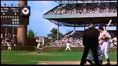 In fact, All-High Stadium has only a single level of stands with a roof. The upper deck in the film appears to have been inserted in post-production, and the scoreboard either matted in or built as a temporary structure over an existing tall smokestack on a building that stands at the north corner of the stadium, presumably part of Bennett High's heating plant. The actual Wrigley does not have smokestacks, but rather houses and small businesses serving as its backdrops.