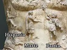 On the breastplate of the statue of Augustus of Prima Porta Hispania appears on the right hand side (on the left when looking at the sculpture). It is found behind the back of Mars, god of war, in a seated and afflicted position carrying the gladius hispaniensis. The fact that it has been represented with its back to Mars and defeated alludes to the victory of Augustus against cantabrians and astures.[3]