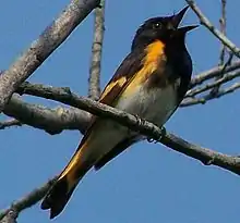 Although perhaps not as common as in the past, the redstart appears to be one of the most stable and abundant species of New World warbler; its numbers exceeded in total by the common yellowthroat, yellow warbler and yellow-rumped warbler, because of much wider natural breeding ranges in those species and perhaps exceeding those in sheer density within appropriate range.[10][11][12] Their breeding is in North America, spanning southern Canada and the eastern United States. They are migratory, wintering in Central America, the West Indies, and northern South America, and are very rare vagrants to western Europe. During the breeding season, the redstart inhabits open-canopy, mostly deciduous forests, second growth, and forest edges. It is insectivorous, often sharing its foraging habitats with other warblers, and is found feeding in the mid to lower regions of a tree or shrub. A wide range of habitats are occupied during migration, including many shrubby areas. On its wintering grounds in Central and South America, the redstart may be found in nearly all woody habitats but tends to avoid non-forested agricultural areas. It is often found in shade-grown coffee plantations, which provide native trees and shrubs, as well as coffee trees. Elevations occupied vary by location, with redstarts found at elevations up to 3,000 m (9,800 ft) in South America, but only 1,500 m (4,900 ft) in Jamaica.