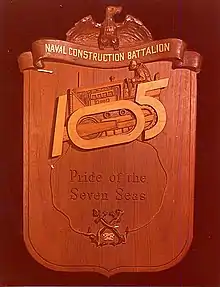 ACB 2 has its beginnings in World War II. It started out as the 105th Naval Construction Battalion. She was commissioned 24 July 1943 at Camp Peary.[2] From there she was sent to Camp Parks, in California, and then to Advance Base Depot Port Hueneme. While there the battalion became part of movie history by providing the men and equipment for staging portions of the filming of The Fighting Seabees.[4] At Port Hueneme the 105th boarded the United States Army Transport Sea Devil bound for New Guinea via Townsville, Australia.[2] There, she would join the 7th Fleet at Naval Base Milne Bay, Milne Bay and her sister battalion the 104th.[5] At Milne, the primary tasks were the construction of an Amphibious Training Center, the battalion's camp, a Liberty ship pier, and a tank farm on Swinger Bay (adjacent the Coral Sea).[2] The Seabee's historian William Huie states that if all the warehouses built by the 105th at Milne were combined it would create a structure 40' x 75,000' (15 miles).[5] The battalion also assisted the Army with the construction of Turnbull Field on Stringer bay.