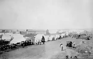 In 1901, the federal government confiscated the lands of the Kiowa, Comanche and Arapaho Reservations, and opened the surplus land to white settlement. On August 6, 1901, an auction was held for homesteads and town lots. Around 5,000 people were living in "Rag Town" on the east edge of Anadarko awaiting the auction. Although 20,000 people were present for auction day, Anadarko's population dwindled to 2,190 in 1907.[6]
