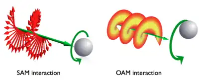 When a light beam carrying nonzero angular momentum impinges on an absorbing particle, its angular momentum can be transferred on the particle, thus setting it in rotational motion. This occurs both with SAM and OAM. However, if the particle is not at the beam center the two angular momenta will give rise to different kinds of rotation of the particle. SAM will give rise to a rotation of the particle around its own center, i.e., to a particle spinning. OAM, instead, will generate a revolution of the particle around the beam axis.[3][4][5] These phenomena are schematically illustrated in the figure.