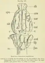 The skull of Anoplotherium is narrow and elongated, with a constricted postorbital bone indicating poor brain development. It features robust sagittal and nuchal crests, the former having high elevations and emerging from low postorbital ridges and the latter having complicated elevation shifts. The back has a circular foramen magnum and large occipital condyles. The underside has an elongated palate with glenoid surfaces and strong post-glenoid processes of the squamosal bone.[60]