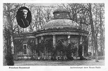 The Antique Temple is a small round temple in the west part of Sanssouci Park in Potsdam. Frederick the Great had the building constructed to house his collection of classical works of art,[1] antique artifacts, coins and antique gems. Carl von Gontard created the building in 1768/69 near the New Palace north of the Central Alley, as a complement to the Temple of Friendship situated south of the Alley. Since 1921 the Antique Temple has been used as a mausoleum for members of the House of Hohenzollern and is not open to the public.