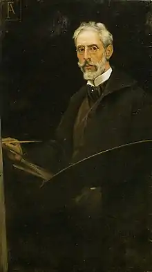 Antonio Fabrés was born in Barcelona (Catalonia, Spain) in 1854. He started studying at the Escola de la Llotja in his native city at the age of 13. His father was a draughtsman and his uncle a silversmith. When he turned 21, he received a grant to study in Rome.[1] There are records of his sculptures from early in his career but later on he became a painter almost exclusively. He joined Marià Fortuny with a group that became known for their intense realism. Their popularity grew with the taste of the bourgeoisie seeking exotic images with oriental or medieval themes. He went back to Barcelona in 1886 and in 1894 he moved to Paris. The popularity he had earned during his decade in Italy helped him open a large studio where he could create complex scenes for the upper classes.[2]