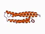 APOE is 299 amino acids long and contains multiple amphipathic α-helices. According to crystallography studies, a hinge region connects the N- and C-terminal regions of the protein. The N-terminal region (residues 1–167) forms an anti-parallel four-helix bundle such that the non-polar sides face inside the protein. Meanwhile, the C-terminal domain (residues 206–299) contains three α-helices which form a large exposed hydrophobic surface and interact with those in the N-terminal helix bundle domain through hydrogen bonds and salt-bridges. The C-terminal region also contains a low density lipoprotein receptor (LDLR)-binding site.[18]