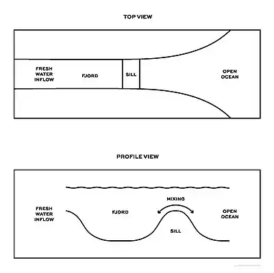 Aquatic sills can influence water circulation by restricting the movement of bottom water masses, resulting in partial to total separation of two basins. The restricted water circulation affects temporal variations in salinity and can result in oxygen depletion in deeper water masses.[5]