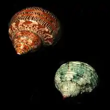 Archaeogastropoda (also known as Aspidobranchia[1]) was a taxonomic order of sea snails used in older classifications of gastropods, i.e. snails and slugs. Archeogastropoda are marine prosobranch gastropod mollusks, mainly herbivores, typically having two gills and a double-chambered heart, with the eggs and sperm discharged directly into the water. They were traditionally regarded as a relatively primitive group.