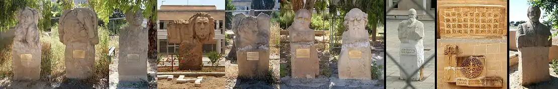 - a marble plaque at the Acropolis Park in Strovolos, Nicosia (1982–1988), in memory of the 1.500.000 martyrs of the Armenian genocide. This was erected by the Armenian Ethnarchy and was placed at the western part of the park. It was unveiled on 24 April 1982 by Bishop Zareh Aznavorian and Archbishop Ardavazt Terterian. For various reasons, the monument was removed in 1988 and was kept at the basement of the Nicosia Nareg School until it was moved to the Kim cemetery in 2000. Today, it is broken into two pieces.