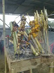Assamese cuisine is the cuisine of the Indian state of Assam. It is a style of cooking that is a confluence of cooking habits of the hills that favour fermentation and drying as forms of preservation[4] and those from the plains that provide extremely wide variety of fresh vegetables and greens, and an abundance of fish and meat. Both are centred on the main ingredient — rice. It is a mixture of different indigenous styles with considerable regional variations and some external influences. The traditional way of cooking and the cuisine of Assam is very similar to South-East Asian countries such as Thailand, Burma (Myanmar) and others. The cuisine is characterized by very little use of spices, little cooking over fire, and strong flavours due mainly to the use of endemic exotic fruits and vegetables that are either fresh, dried or fermented. Fish is widely used, and birds like duck, pigeon, squab, etc. are very popular, which are often paired with a main vegetable or ingredient; beef used to be eaten before British colonialism,[5] and some continue to do so.[6] Preparations are rarely elaborate. The practice of bhuna, the gentle frying of spices before the addition of the main ingredients so common in Indian cooking, is absent in the cuisine of Assam.[7] The preferred oil for cooking is the pungent mustard oil.