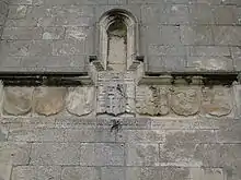 All Saints Church, Aughton is located at the far end of the village and overlooks vast expanses of the floodplains of the River Derwent. Tucked away in the village, it can only be accessed on foot through a small gate and field adjacent to Aughton Hall. An historic church, famous for its association with Robert Aske, leader of the insurgents in the Pilgrimage of Grace, October 1536. Aske was executed for treason on 12 July 1537.[3] The church displays a mixture of architectural designs as it has been altered throughout the years, but is noted especially for its Norman arch between the chancel and nave. On the chancel floor a well-preserved ancient brass of a knight in 15th century plate armour and his lady can be found, although much of the lady is now missing. Standing in the churchyard and looking up at the tower, (which was rebuilt by Christopher Aske sometime after 1536), a shield with six quarterings can be seen engraved on the outside wall, now badly weathered but it offers the following inscription in old French text: "Christofer le second filz de Robert Ask chr oblier ne doy, Ao Di 1536." This is literally translated as: "Christopher, the second son of Robert Aske, chevalier, ought not to forget the year of our Lord 1536." Also on the tower is a benchmark of the time and carved, in sunk relief, a newt or salamander otherwise known in Old English as an Ask.