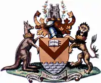 On the dexter side a Kangaroo proper, and on the sinister side a Lion Guardant also proper, each gorged with a Mural Crown Or.