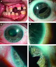 a) Microdontia and hypodontia. b) Slit pupil and iris atrophy right eye. c) Corectopia with iris atrophy left eye. d) Posterior embryotoxon right eye. e) Posterior embryotoxon left eye. f) Broad peripheral anterior synechiae right eye.[1]