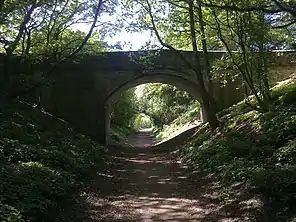 The line opened on 1 September 1860[1] and was operable for more than 100 years. Passenger numbers declined sharply after the Second World War and passenger services ended in 1951, although commercial traffic continued until 1966.[2] Most of the track was lifted apart from a line into the Blackbridge landfill site from the Hatfield end, which continued until 1971 before the whole line was finally closed. Today, there are still visual reminders of the line, with two bridges still intact, the original fencing and even part of a collapsed railway signal.