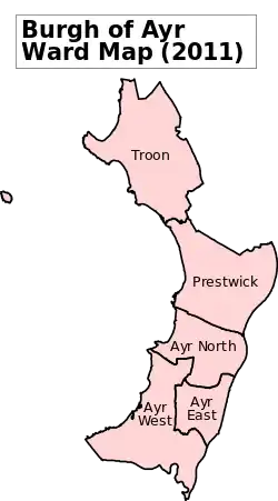 The Ayr constituency covers the towns of Ayr, Prestwick and Troon, and takes in the electoral wards of:[5]