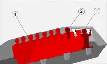 The troop compartment is behind the crew compartment and in front of the engine compartment. The BTR-60P can transport up to 16 fully equipped soldiers. This number reduced to 14 in BTR-60PB. As the BTR-60P did not have a roof, it was covered with a tarpaulin when traveling in bad weather conditions. It was also covered with bows and canvas. Also, all BTR-60 models had three firing ports on each upper side of the hull through which the infantry being transported could fire at the enemy with their personal weapons. The difference between models was in the position of these three firing ports. The BTR-60P and BTR-60PA had the firing ports positioned in a row between the middle and the front part of the troop compartment. In the BTR-60PB, the firing ports were relocated; one was next to the driver and commander, one next to the gunner and one in the side of the troop compartment.[1][5]