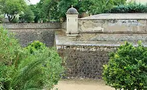 It has the number 2 in the Plan of bastions. It is located next to the "Semi-bastion of San Antonio" and before the one of Trinidad, in the eastern zone of the bastioned enclosure, in front of the Rivillas river. Between these two bastions is the Merida Gate. Its construction dates from the last decades of the 17th century, the same period as that of the bastion of Trinidad, making both the oldest bastions in the enclosure.[16] It had a series of bartizan of which only their bases remain, as well as embrasures at the top of the defensive wall, but at present there are no remains of them. In 1772 the right flank of the bastion was provided with a series of arrowslits connected by a gallery for the circulation of the riflemen. The interior zone is very deteriorated.[20]