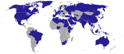 The People's Republic of Bangladesh has a growing number of diplomatic and consular missions around the world. As of 2022, it has over 82 missions around the world, with 59 being embassies or high commissions; 20 being consular missions; and two permanent missions to the United Nations in New York City and Geneva.[1]