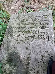 On 18 October 1894, sixteen months after his ennoblement, Drumlanrig died at Quantock Lodge, Somerset, at age 27, from injuries received during a shooting party. The inquest returned a verdict of "accidental death", but his death was also rumoured to be suicide or murder. He was buried in the family burial ground at Kinmount, Dumfriesshire,[1] where his gravestone states he "was killed by the accidental discharge of his gun". He was unmarried and his younger brother Lord Percy Douglas became heir to his father's titles. It was speculated at the time, and evidence suggests,[4] that Drumlanrig may have had a homosexual relationship with Rosebery. It has been further suggested that Queensberry had threatened to expose the Prime Minister's supposed proclivities if his government did not vigorously prosecute Oscar Wilde for Wilde's relationship with Drumlanrig's younger brother, Lord Alfred Douglas. Rosebery was, by most accounts, happily married until the death of his wife in 1890, though gossip that Rosebery was homosexual or bisexual was widespread. Queensberry believed, as he put it in a letter, that "Snob Queers like Rosebery" had corrupted his sons, and he held Rosebery indirectly responsible for Drumlanrig's death.[5]