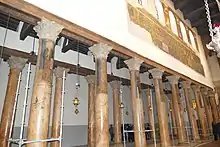 In the late 4th century, a large basilica church dedicated to Mary, mother of Jesus was constructed in Ephesus in the former south stoa (a commercial basilica) of the Temple of Hadrian Olympios.[49][50] Ephesus was the centre of the Roman province of Asia, and was the site of the city's famed Temple of Artemis, one of the Seven Wonders of the Ancient World.[51] It had also been a centre of the Roman imperial cult in Asia; Ephesus was three times declared neokoros (lit. 'temple-warden') and had constructed a Temple of the Sebastoi to the Flavian dynasty.[51] The Basilica of the Virgin Mary was probably the venue for the 431 Council of Ephesus and the 449 Second Council of Ephesus, both convened by Theodosius II.[49] At some point during the Christianisation of the Roman world, Christian crosses were cut into the faces of the colossal statues of Augustus and Livia that stood in the basilica-stoa of Ephesus; the crosses were perhaps intended to exorcise demons in a process akin to baptism.[9] In the eastern cemetery of Hierapolis the 5th century domed octagonal martyrium of Philip the Apostle was built alongside a basilica church, while at Myra the Basilica of St Nicholas was constructed at the tomb of Saint Nicholas.[24]