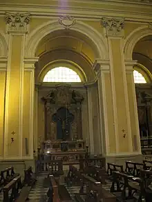 The interior has a basilica plan with three naves, 58.75 meters long and 24 meters wide at the transept, 36 meters high at the dome lantern.[26] The nave is covered by a lunetted barrel vault, while the two side naves, located to the left and right of the main nave, are covered by barrel vaults arranged orthogonally to the vault at the main nave.[26] Natural lighting is provided in the nave by six lunettes, three on each side, while in the dome by the lantern windows.[26] The total expenditure for the work was between 12,000[26] and 24,000 pontifical scudi.[27]