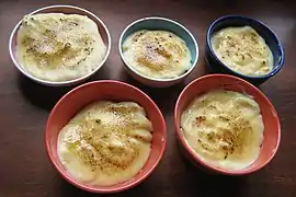 Gerezi beltza arno gorriakin[5] is a cherry soup served warm or cold. The cherries are poached in wine, often with enough sugar added to make a light syrup. A cherry without pits is preferred for this dish. To release their flavor, the cherries are carefully pitted or cut in half. Usually the soup is prepared on the day it will be served, because 24 hours is enough time for the cherries to blanch noticeably in the liquid. The soup is often served with a dollop of sour cream, crème fraîche, or ice cream.