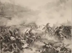 Since the beginning of April 1631, Magdeburg was besieged by imperial troops. The city's commandant Falkenberg was ordered by Gustavus Adolphus to hold the city for at least two months. Initially, Falkenberg had been able to take advantage of Tilly's hesitation for his siege, by strengthening the city's defenses and reorganizing his 2,500-strong garrison to be supported by 5,000 armed citizens.[41] But after the fall of Frankfurt, Tilly returned to Magdeburg at the end of April. He systematically attacked the city's outer defenses from several sides, which were gradually abandoned by the Swedish defenders. The Imperial troops dug trenches which, by mid-May, ran only five meters from the city's walls. On May 18, Tilly issued a final ultimatum for surrender to the city, which was subsequently refused by the city's counsil. On May 19, Tilly held a council of war with his generals where they decided to make a final assault on the city from six directions the following day.[43] During the morning of 20 May, the city was bombarded by Tilly's guns and Imperial troops broke into the city from several directions. The city was set on fire, Falkenberg and the entire city garrison were massacred, and the Imperial troops pillaged the city for several days while committing cruel acts of violence against the city's 25,000 inhabitants. By the time Tilly ordered an end to the looting on 24 May, Magdeburg was turned into a smoldering ghost town, resulting in the deaths of around 20,000 inhabitants.[44][39][45][46]