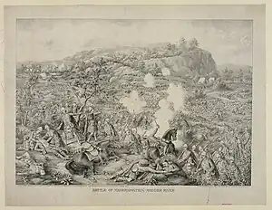 A drizzle started by mid-afternoon on 10 December and continued throughout the artillery bombardment, which was delivered by 24 field guns, four howitzers, and a 4.7-inch naval gun. In preparation for the attack, the British soldiers bivouacked in the rain 3 miles (4.8 km) from the Boer lines.[29] Instead of "softening" the Boer positions, the explosions of lyddite shells against the facing slopes above their trenches merely alerted the Boers to the impending attack.[27] As midnight approached, the rain increased to a downpour and the leading elements of the Highland Brigade commenced their advance towards their objective at the southern end of Magersfontein ridge.[28][30] Wauchope had made a similar night march in his advance on Omdurman in 1898, but this time he was faced not by flat desert terrain and clear skies, but rather by torrential rain, rocky outcrops, and thorn scrub, which caused delays and annoyance.[31] The thunderstorm and the high iron ore content of the surrounding hills played havoc with compasses and navigation.[27]